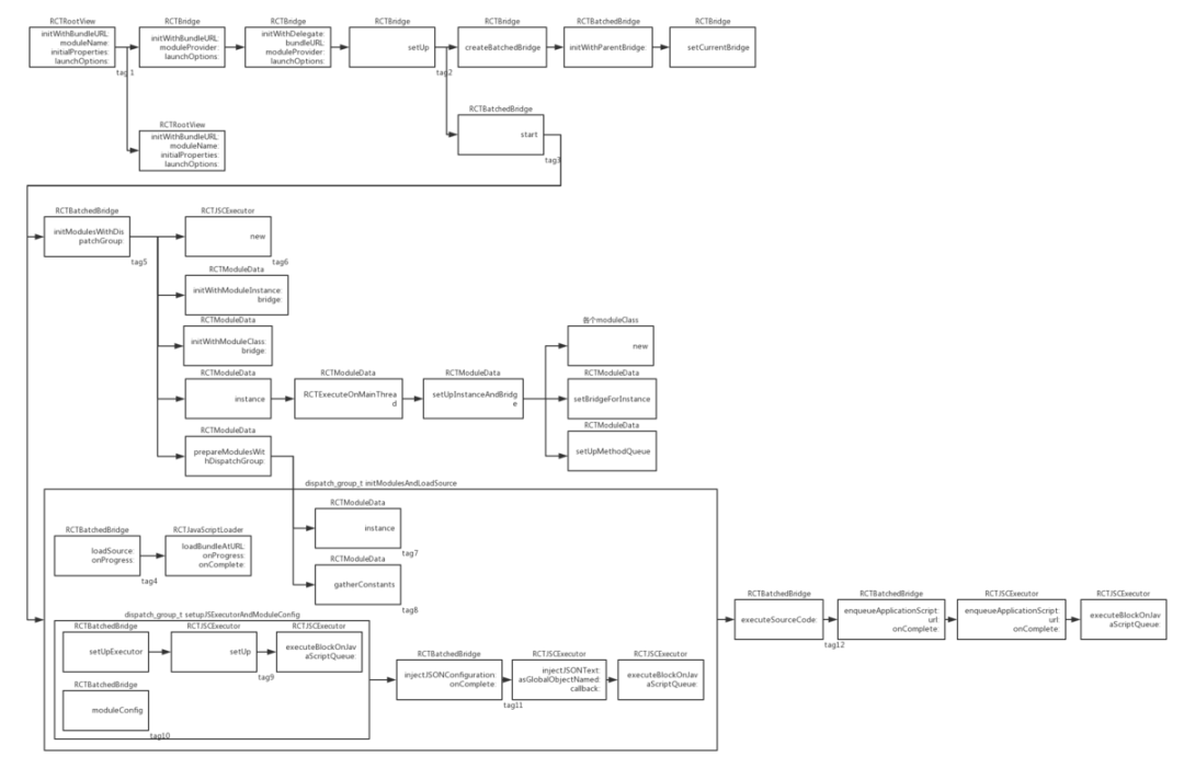 此接口内部会创建一个RCTBridge实例,这个实例就是实现OC与JS沟通的桥梁,具体实现要在RCTBatchedBridge 类中的 start方法内, start中执行了重要的初始化任务,基于大量的GCD实现了异步初始化组件框架的任务。
