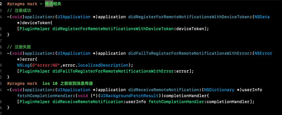 以普元Mobile8.0平台推送组件举例,集成组件后,只需在以下几个方法调用PluginHelper即可。所有的消息处理代码都在推送组件里,增强了主项目代码的可读性。不用考虑复杂的iOS推送接收获取过程。不仅如此,推送组件还提供了获取推送消息,获取设备Token注册Token,设备绑定等等相关的RN接口非常方便调用。