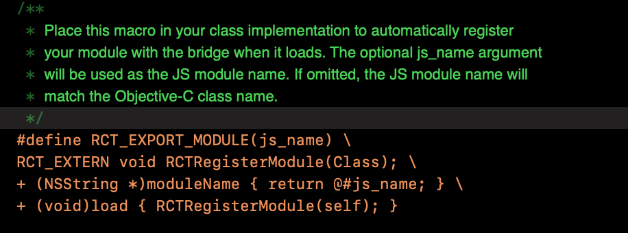 利用react提供的宏定义RCT_EXPORT_MODULE注册: