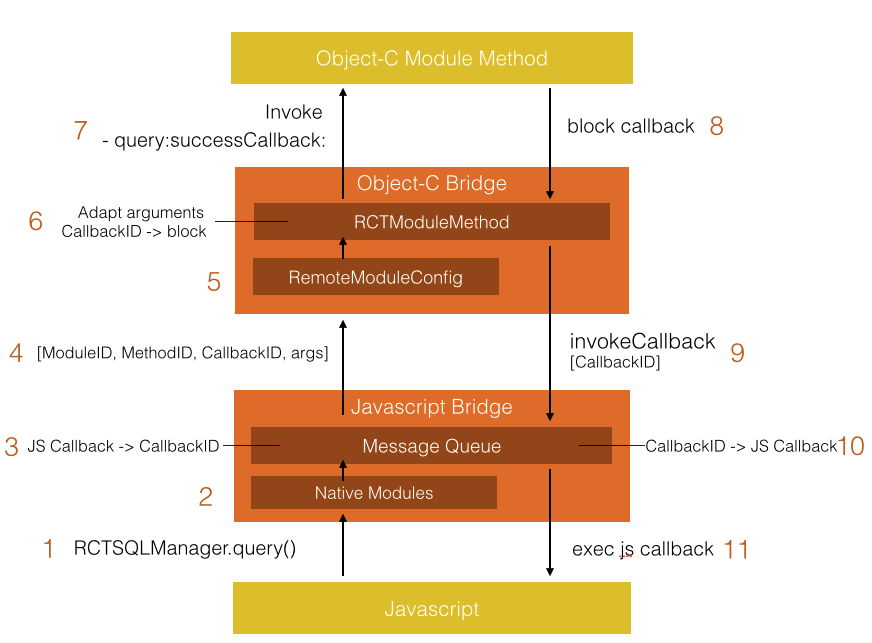 利用runtime就可以使用传递的三个参数完成接口的调用过程;OC调JS某些模块的方法时,也是通过传递ModuleID和MethodID去调用的,都会走到-enqueueJSCall:args:方法把两个ID和参数传给JS的BatchedBridge.callFunctionReturnFlushedQueue,跟JS调OC原理差不多。