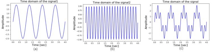 上图展示了混合信号在时域上的表现形式,图(a)为一频率为1Hz,振幅为2的正弦波信号,图(b)为一频率为5Hz,振幅为1的正弦波信号,图(c)为(a)、(b)两信号的叠加结果。