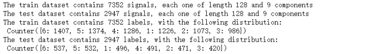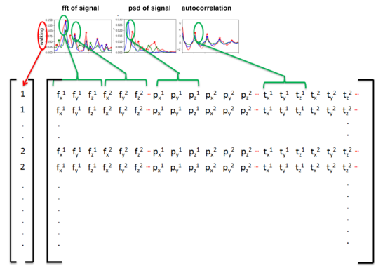 经过上面的简单介绍相信你已经了解并掌握了信号在频域上的变换。写下来让我们运用刚学的知识结合机器学习知识来分析一个实例 Human Activity Recognition Using Smartphones Data Set。该数据集通过在30个不同年龄分布的志愿者上做实验采集得到,在志愿者的腰上固定一手机,手机以50Hz的采样频率采集内嵌加速度计和陀螺仪的数据,志愿者被要求做以下六个动作:walking(行走),walking upstairs(爬楼梯),walking downstairs(下楼梯),sitting(坐着),standing(站着),laying(躺下)。在滤除噪声之后,通过滑动窗口的方式将信号切分成2.56s的窗口,每个窗口包含128个样本。该数据集包含三组数据three-axial linear body acceleration(去除重力加速度的加速度计数据)、three-axial linear total acceleration(包含重力加速度的加速度计数据)、three-axial angular velocity(陀螺仪的数据),因此共有九个分量,其中训练集有7392个窗口,测试集有2947个窗口。