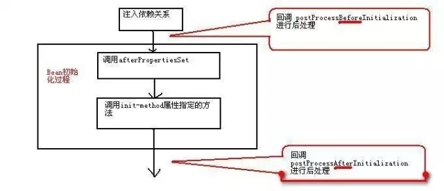 容器中一旦注册了Bean后处理器,Bean后处理器就会自动启动,在容器中每个Bean创建时自动工作,Bean后处理器两个方法的回调时机如下图