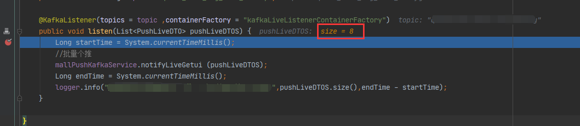 private final String topic = "queue_notify"; @KafkaListener(topics = topic ,containerFactory = "kafkaLiveListenerContainerFactory") public void listen(List<PushLiveDTO> pushLiveDTOS) { Long startTime = System.currentTimeMillis(); //批量个推 pushService.notifyLiveGetui (pushLiveDTOS); Long endTime = System.currentTimeMillis(); }
