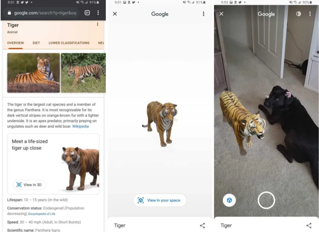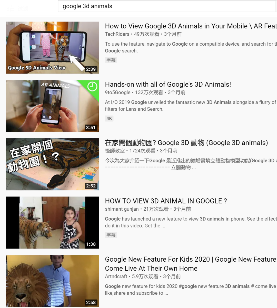 具体怎么玩呢?首先你需要一个AR兼容的手机,装有安卓7.0或iOS11以上系统,在Google搜索老虎/狮子/企鹅等等,在搜索结果里找到3D视图打开就可以了: