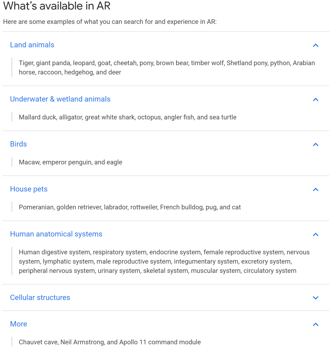 据谷歌support文档显示,目前支持的AR搜索结果包括各种陆地、水生动物,鸟类、宠物,人体器官和系统,细胞结构等等: