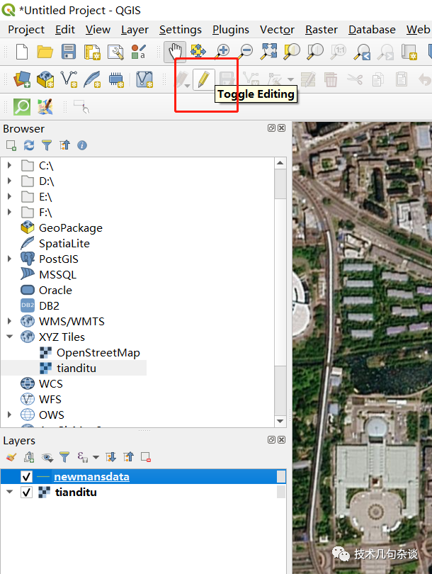 图层创建完成后,选中图层,点击开始编辑(toggle Editing)进行图层的编辑;
