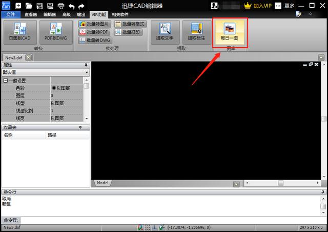 新建一个CAD文件后,点击页面上方菜单一栏的【VIP功能】,进入该功能页面。进入【VIP功能】页面后,点击下方工具框中的【每日一图】按钮。