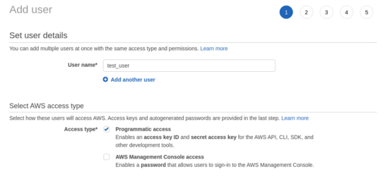 如果还没有安装,首先应该在AWS上创建一个具有编程访问权限的新用户帐户。为此,请选择IAM服务,然后从右侧面板中选择Users,最后按Add User按钮。为用户指定一个名称并选择Programmatic access。
