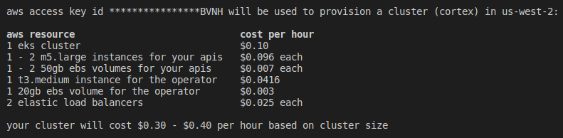 Cortex会要求你提供一些信息,比如你的AWS密钥、你想使用的区域、你想启动的计算实例以及它们的数量。Cortex也会让你知道你会花多少钱来使用你选择的服务。整个过程可能需要20分钟。