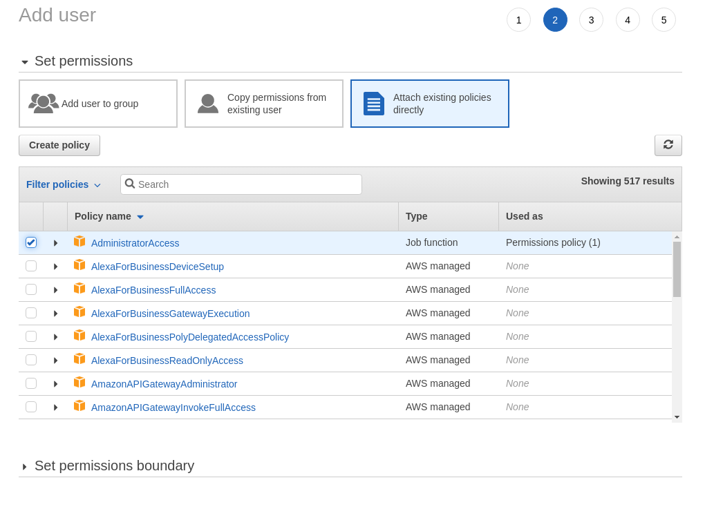 接下来,在Permissions 屏幕中,选择Attach existing policies directly选项卡,然后选择AdministratorAccess。