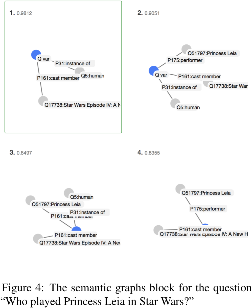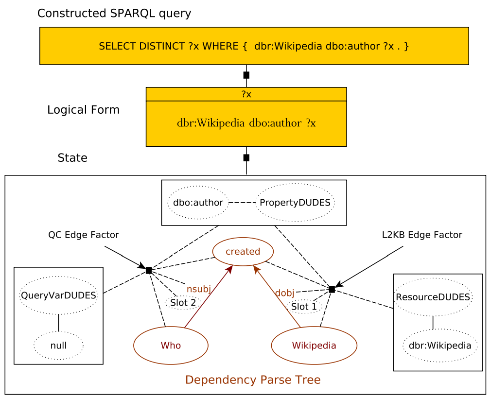 论文简述: 近年来,在RDF数据上实现自然语言问答任务吸引了很多研究者的兴趣,特别是在一系列QALD基准的上下文中。这类任务将一个自然语言问题映射到一个可执行的表单,例如SPARQL,这样就可以从给定的知识库中提取答案。到目前为止,提出的大多数解决方案是单语的,且并依赖一组硬编码规则来解释问题,最后将它们映射到SPARQL查询中。本文提出了第一个多语言QALD管道,它从训练数据中归纳出一个模型,用于将自然语言问题映射为概率逻辑形式。本文方法学会了将通用语法依赖表示映射到基于DUDES的语言无关逻辑形式,然后将DUDES映射到SPARQL查询。我们的模型建立在因子图上,依赖于从关系图中提取的特征和相应的语义表示。我们依赖近似推断技术,特别是Markov Chain Monte Carlo方法,以及Sample Rank实现目标排序和参数更新。本文重点在于方法开发,为了克服词汇差距,还提出了一个新的组合机器翻译和字嵌入方法。