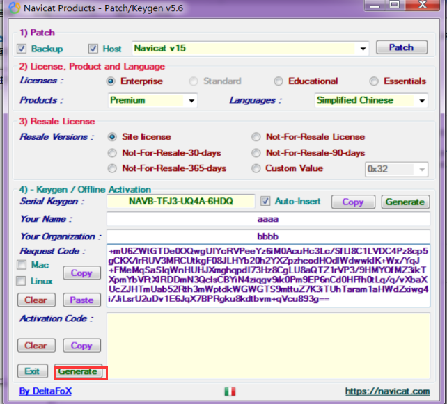 4、将Navicat手动激活窗口的请求码框中内容复制到注册机Request Code框中,点击Activation Code下面的Generate按钮。