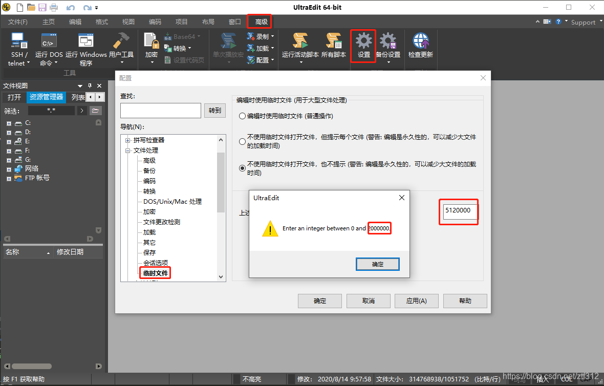 UltraEdit原始设置是限制51200大小的文件,有时候进行文件排序很容易超出限制,就会报出缓存错误.