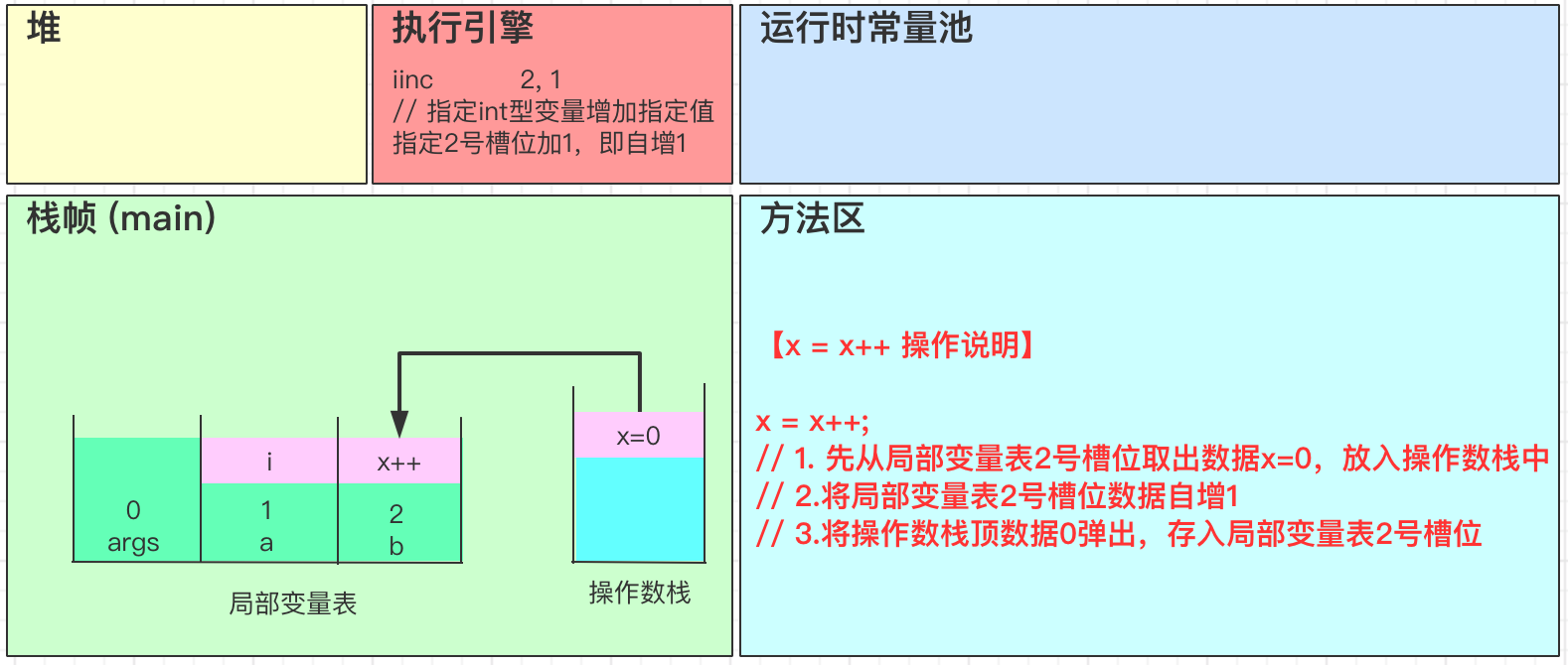 为了更好说明:x = x++ 执行后为什么还是原来的值,特别原理图说明。如下: