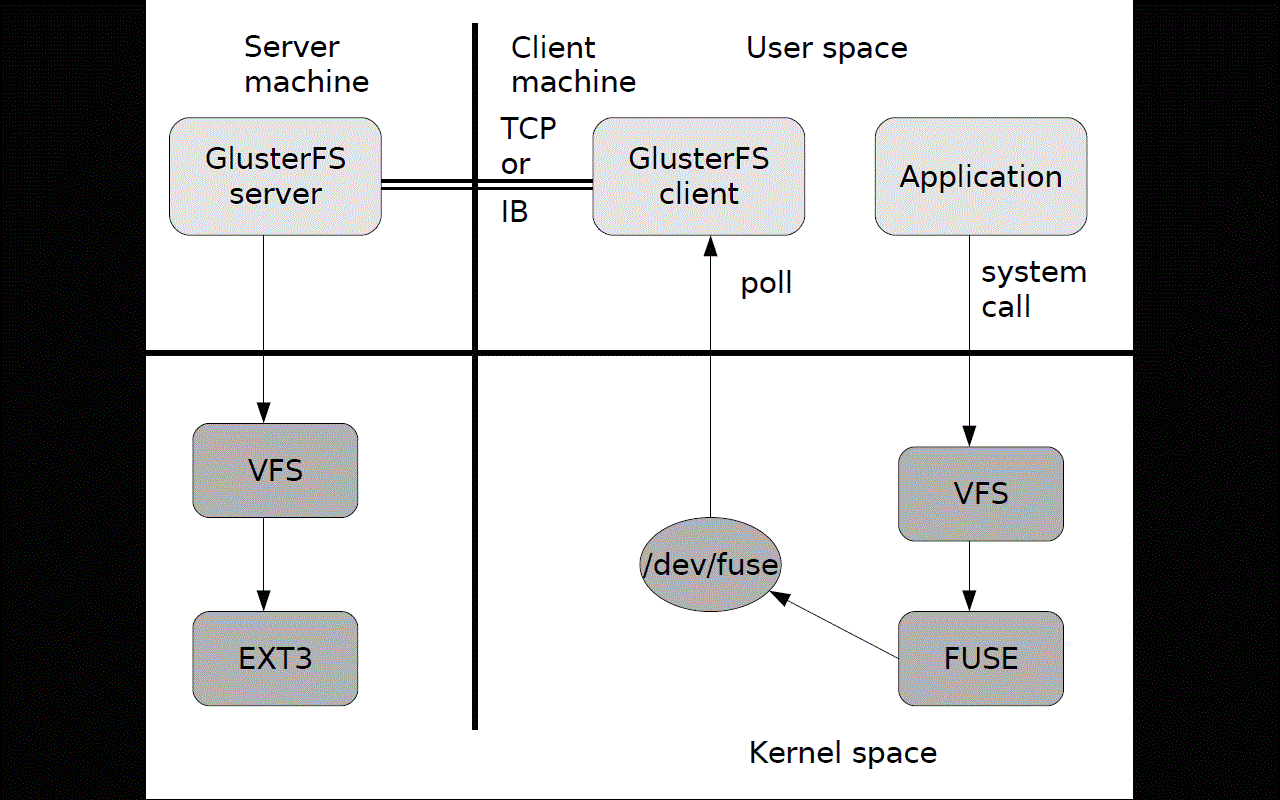 VFS 将数据递交给FUSE 内核文件系统:在启动 glusterfs 客户端以前, 需要想系统注册一个实际的文件系统FUSE,如上图所示,该文件系统与ext3在同一个层次上面, ext3 是对实际的磁盘进行处理, 而fuse 文件系统则是将数据通过/dev/fuse 这个设备文件递交给了glusterfs client端。所以, 我们可以将 fuse文件系统理解为一个代理。