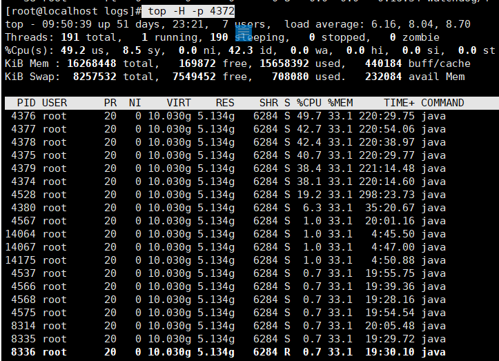 执行 jstack java 4372(进程号) >> cpu.txt ,将进程线程使用情况输出到文件内