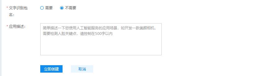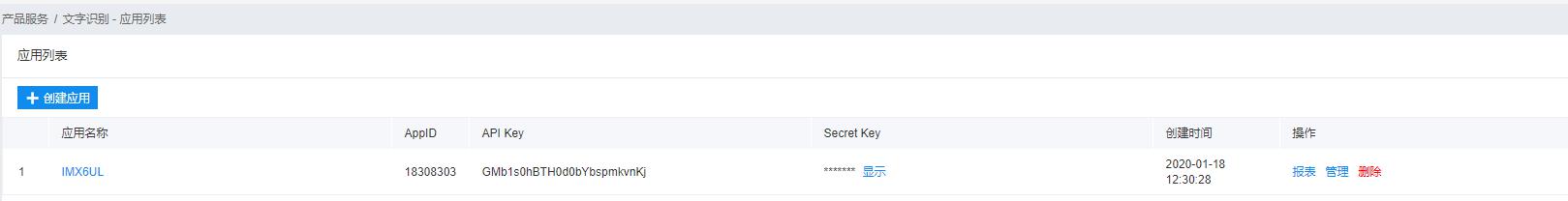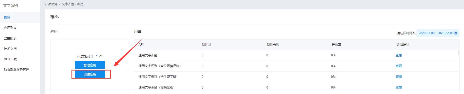 3.在文字识别管理里面新建一个应用服务,点击创建应用。