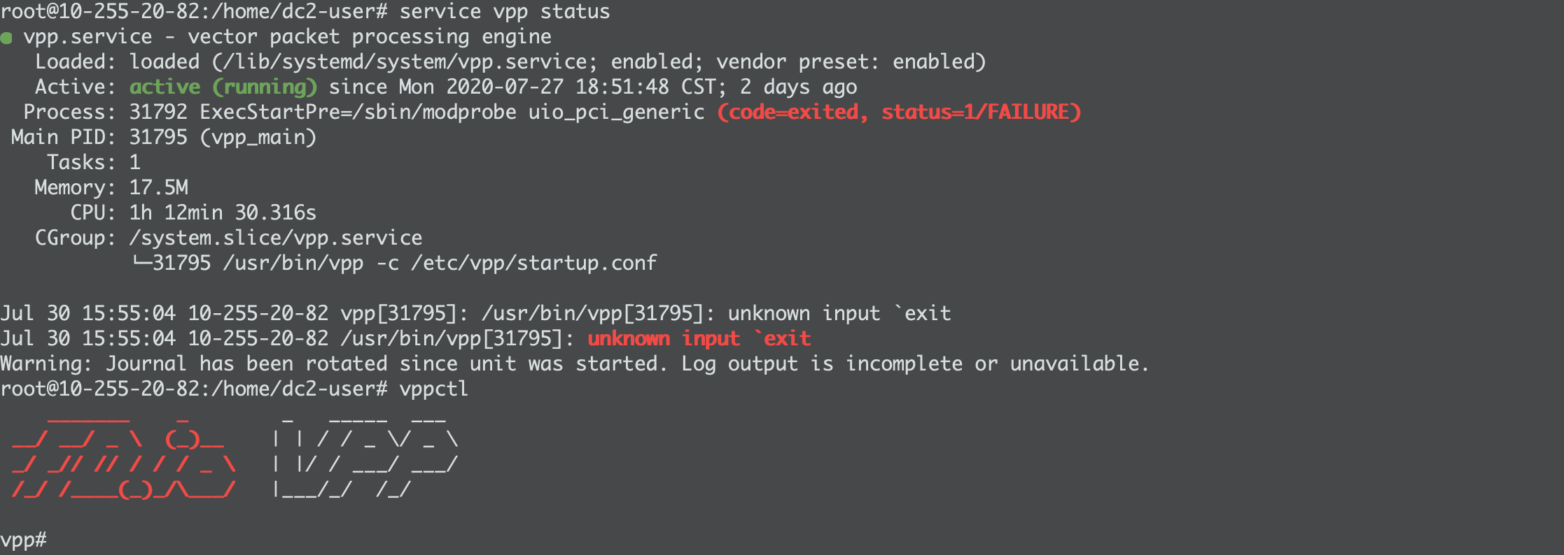 root 31795 1.7 0.4 18141108 18844 ? Ss Jul27 72:36 /usr/bin/vpp -c /etc/vpp/startup.conf