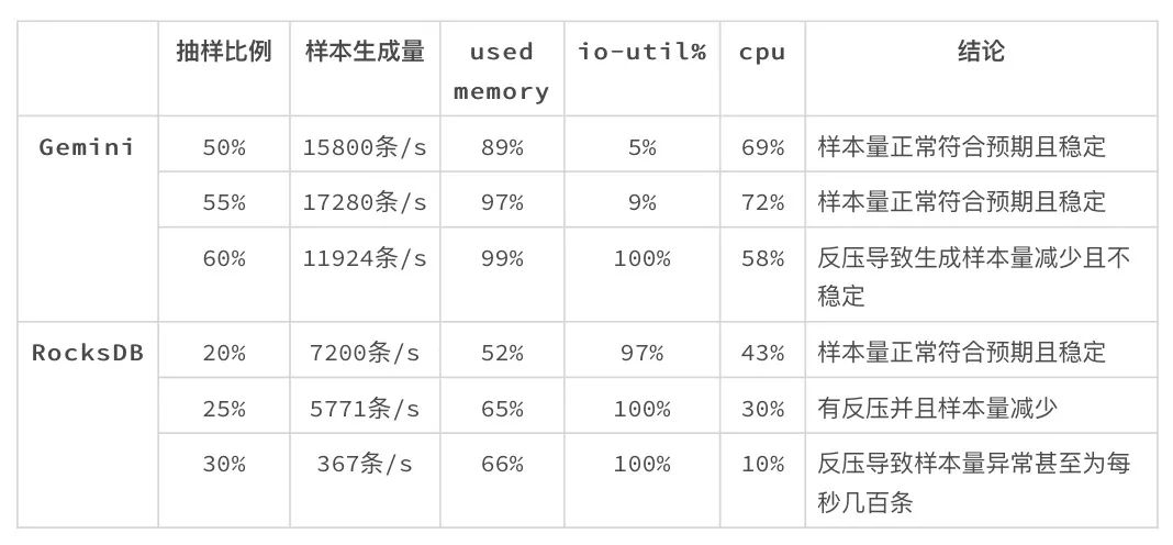 Note:全量的样本拼接负载使用 16 台机器无法完全服务,因此我们通过对数据进行不同比例的抽样来进行压测。当出现反压时,我们认为作业已经达到性能瓶颈。