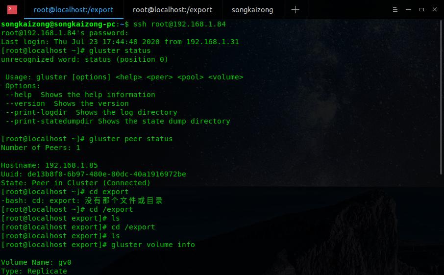 gluster volume create gv0 replica 2 192.168.1.84:/export 192.168.1.85:/export force