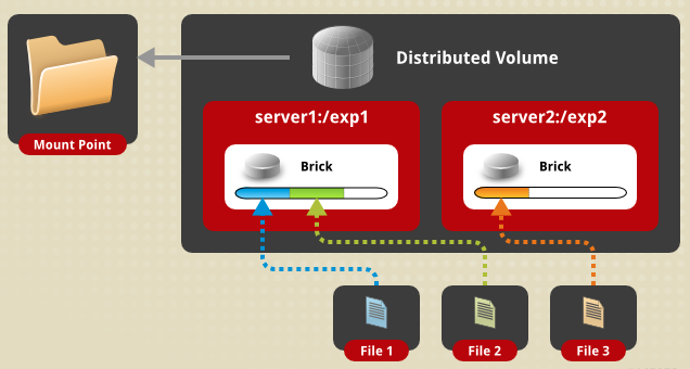 如果未指定任何卷类型,则这是默认创建的卷类型。 在这里,文件分布在卷中的各个块之间。 因此,file1只能存储在brick1或brick2中,而不能存储在两者中。 因此,没有数据冗余。