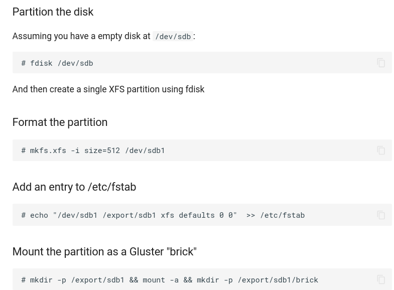 这里要根据官方文档的方式来创建brick的话,需要理解linux磁盘管理的操作。官方操作步骤如下: