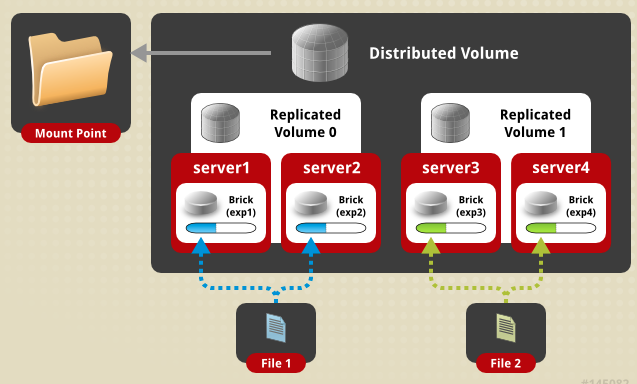 文件分布在复制的Brick中。 块数必须是副本数的倍数。 同样,我们指定Brick的顺序也很重要,因为相邻的Brick成为彼此的复制品。