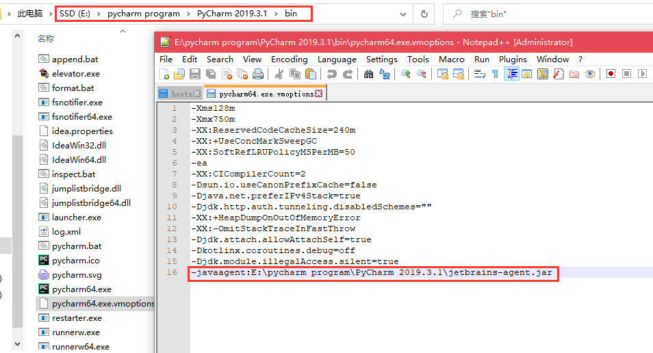 比如我的是:-javaagent:E:\pycharm program\PyCharm 2019.3.1\jetbrains-agent.jar