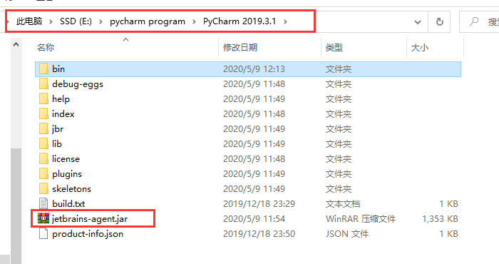 里面总共三个文件,一个pycharm2019.3.1的安装包,一个激活码,一个jar补丁压缩包,没有安装的先安装软件