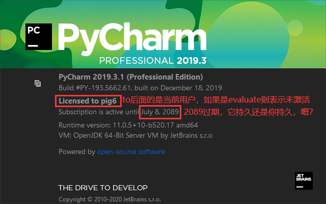 有人可能没激活到89年,若只是改exe.vmoptions文件不行,进入pycharm后从里面下手,Help -> Edit Custom VM Options,在那里面最下一行填路径-javaagent:E:\pycharm program\PyCharm 2019.3.1\jetbrains-agent.jar
