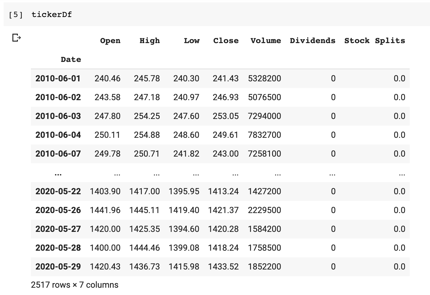 - 第15行-创建tickerDf数据帧并定义日期范围(从2010年5月31日到2020年5月31日)和时间段(1天)。