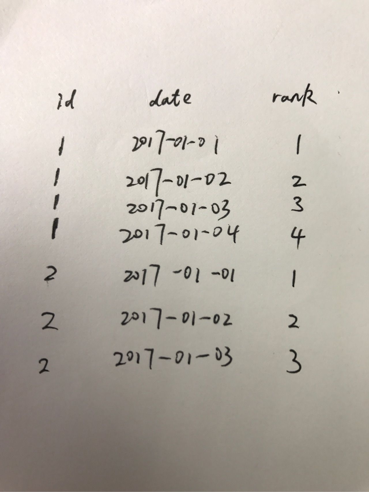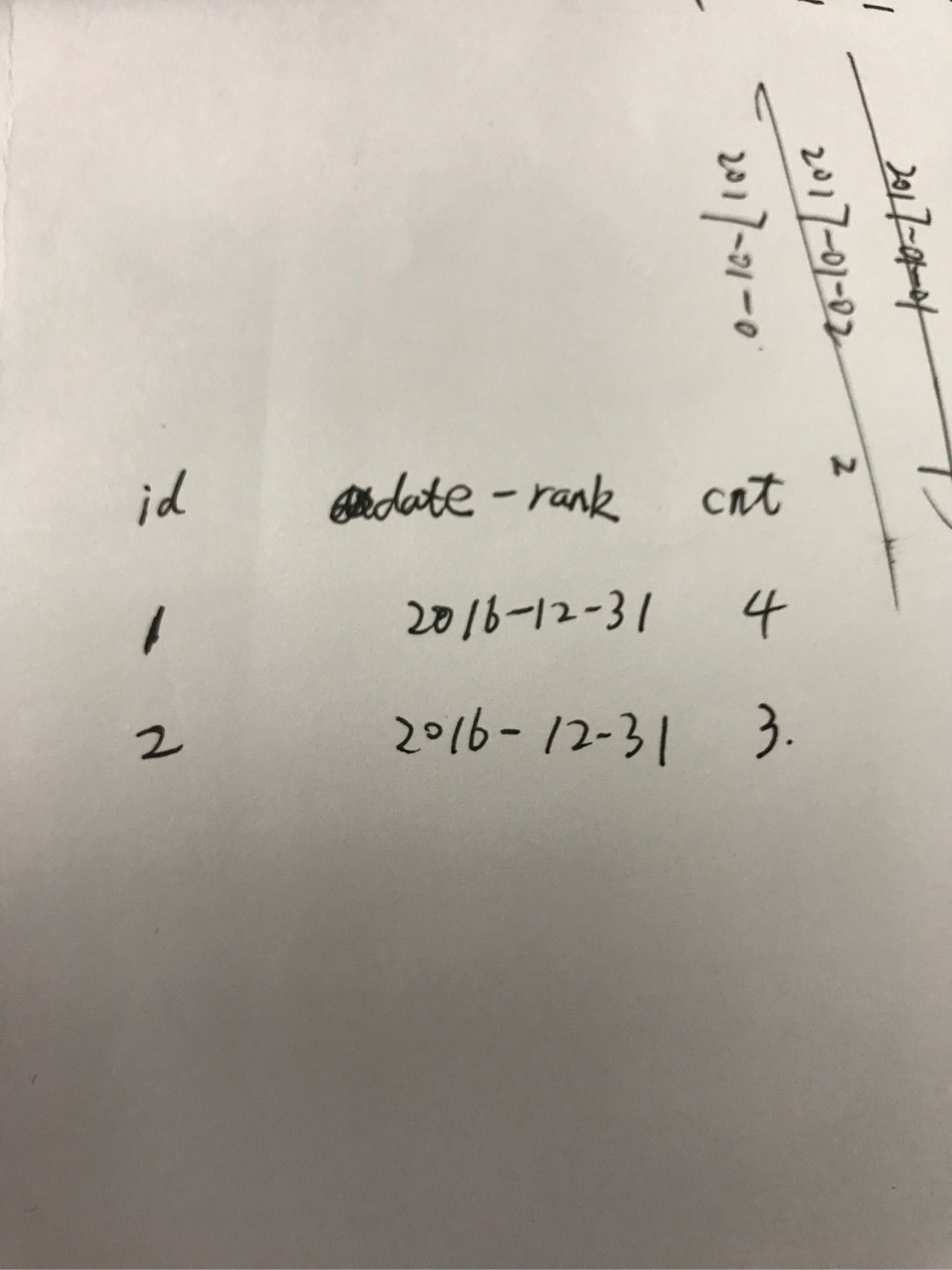 用date-rank作为一个新的字段,再count不同的date-rank作为cnt,并且group by id,(date-rank),得到如下结果: