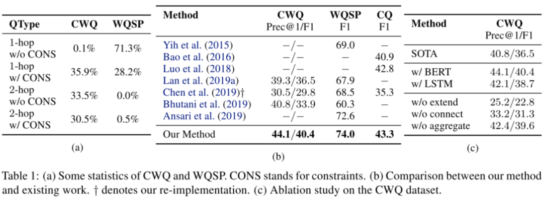 本文的实验在三个数据集上进行:ComplexWebQuestions (CWQ),其中超过 30% 的问题有 2-hop 关系和约束;WebQuestionsSP (WQSP),仅有 0.5% 的问题有 2-hop 关系和约束;ComplexQuestions (CQ),没有针对每个问题提供参考的查询图,大多数问题有 1-hop 关系。