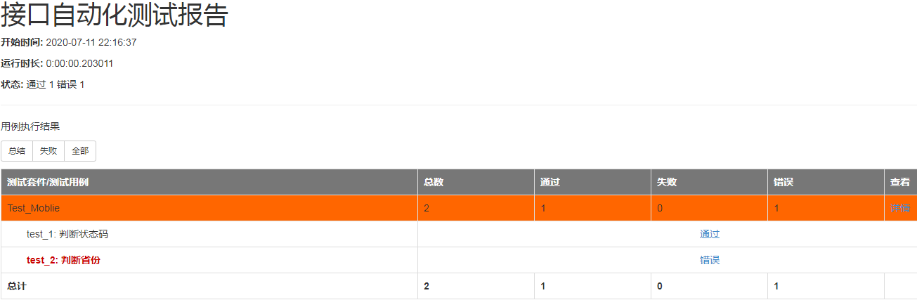 打开完成后生成的测试报告,可以看出本次测试共执行了2条测试用例,1条成功,1条失败