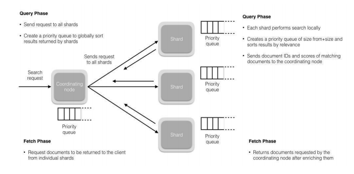 2、在初始 查询阶段 时,查询会广播到索引中每一个分片拷贝(主分片或者副本分片)。 每个分片在本地执行搜索并构建一个匹配文档的大小为 from + size 的优先队列。PS:在搜索的时候是会查询 Filesystem Cache 的,但是有部分数据还在 MemoryBuffer,所以搜索是近实时的。