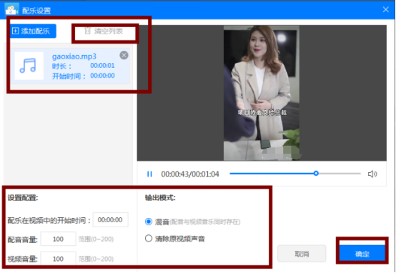 新窗口跳出后,我们需要在里面进行配乐的添加,如下图左上角所示。在窗口下方还可以进行一些操作,比如配乐在视频中开始的时间、视频音量的大小、配音音量的调节。我们在窗口中间还可以修改配乐的输出模式(混音或者清除原视频声音);以上都设置完毕后,点击“确定”按钮即可。