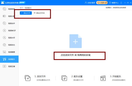 进入“视频配乐”的功能栏后,我们需要把视频文件导进来,可以按照软件的提示进行操作,比如点击“添加文件”、“添加文件夹”、“拖拽进此区域”等。