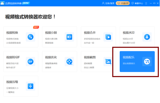 第一步:进入主功能界面后,我们需要点击主界面中第二行的倒数第一个功能方块——“视频配乐”。