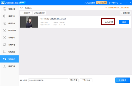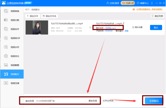第三步:跳回主界面后,我们可以对输出目录进行自定义修改(也可以不管,直接保存在电脑桌面,这样方便查看。修改视频文件的保存位置后,点击“全部配乐”即可。