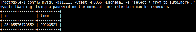 mysql -p111111 -utest -P8066 -Dschema1 -e "create table tb_autoIncre(id bigint,time char(120));"