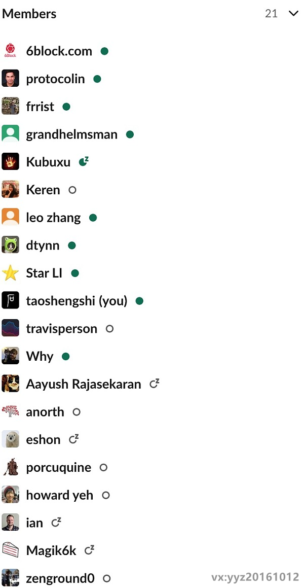 在Slack上创建了一个讨论组fil-fsrf,采取邀请制,目前安全研究小组一共集结了21位全球矿工,原力区两位代码矿工应邀加入,包括dtynn和taoshengshi。