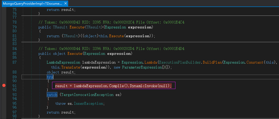接下来就用 dnspy 去定位一下 MongoQueryProviderImpl.Execute 到底干的啥,截图如下: