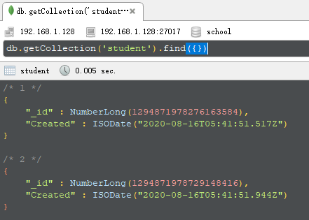 如果你细心的话,你会发现刚才案例中的 Created 时间是 2020/8/16 4:24:57, 大家请放心,我不会傻到凌晨4点还在写代码,好了哈,看看到底问题在哪吧, 可以先看看 mongodb 中的记录数据,如下: