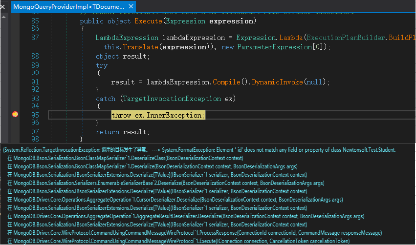 这个堆栈信息就非常清楚了,原来是在 MongoDB.Bson.Serialization.BsonClassMapSerializer.DeserializeClass 方法中出了问题,接下来找到问题代码,简化如下: