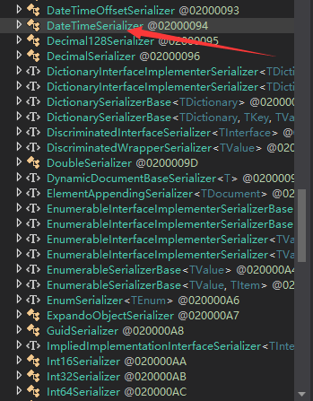 从 ISODate 可以看出,这是格林威治时间,按照0时区存储,所以这个问题转成了如何在获取数据的时候,自动将 ISO 时间转成 Local 时间就可以了,如果你看过底层源码,你会发现在 mongodb 中每个实体的每个类型都有一个专门的 XXXSerializer,如下图: