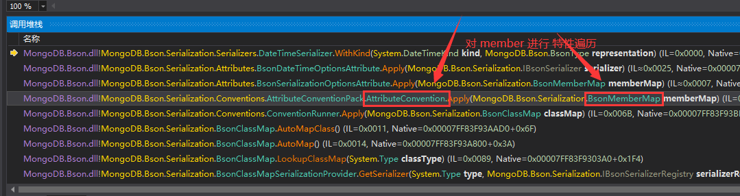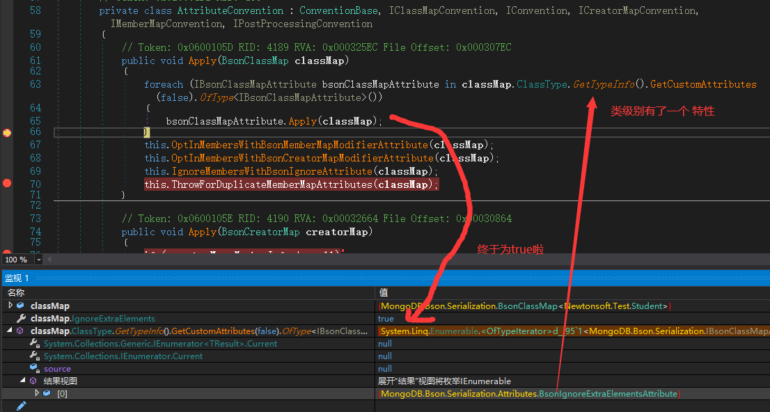 也就是: foreach (IBsonClassMapAttribute bsonClassMapAttribute in classMap.ClassType.GetTypeInfo().GetCustomAttributes(false).OfType<IBsonClassMapAttribute>())这句话,这里的 classMap 就是 student,只有让 foreach 得以执行才能有望 classMap.IgnoreExtraElements 赋值为 true ,接下来找找看在类上有没有类似 IgnoreExtraElements 的 Attribute,嘿嘿,还真有一个类似的: BsonIgnoreExtraElements ,如下代码: