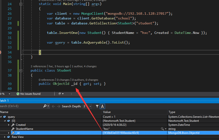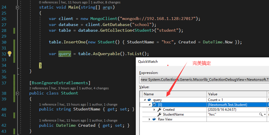 table.InsertOne(new Student() { StudentName = "hxc", Created = DateTime.Now });