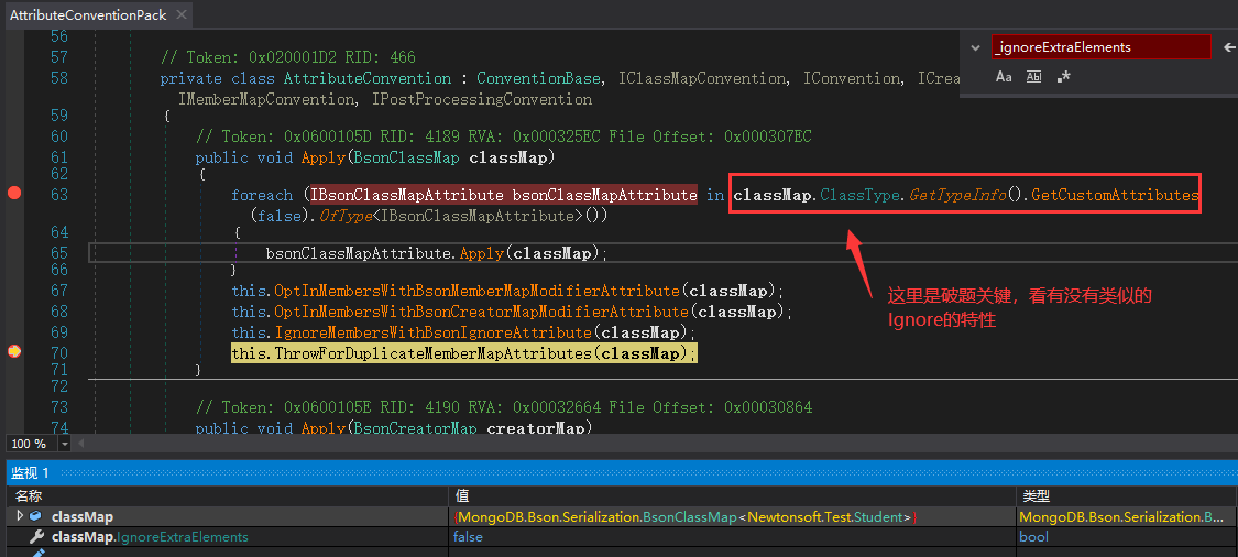 上面的代码逻辑非常清楚,要么 student 中存在 _id 字段,也就是 trieNameDecoder.Found, 要么使用 忽略未知的元素,也就是 this._classMap.IgnoreExtraElements,添加字段容易,接下来看看怎么让 IgnoreExtraElements = true,找了一圈源码,发现这里是关键: