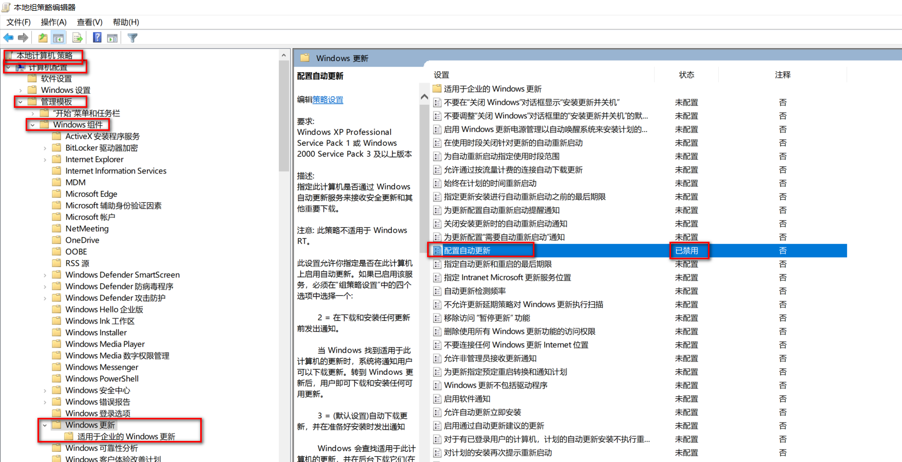 - 在本地策略中禁止win10更新,如下图
